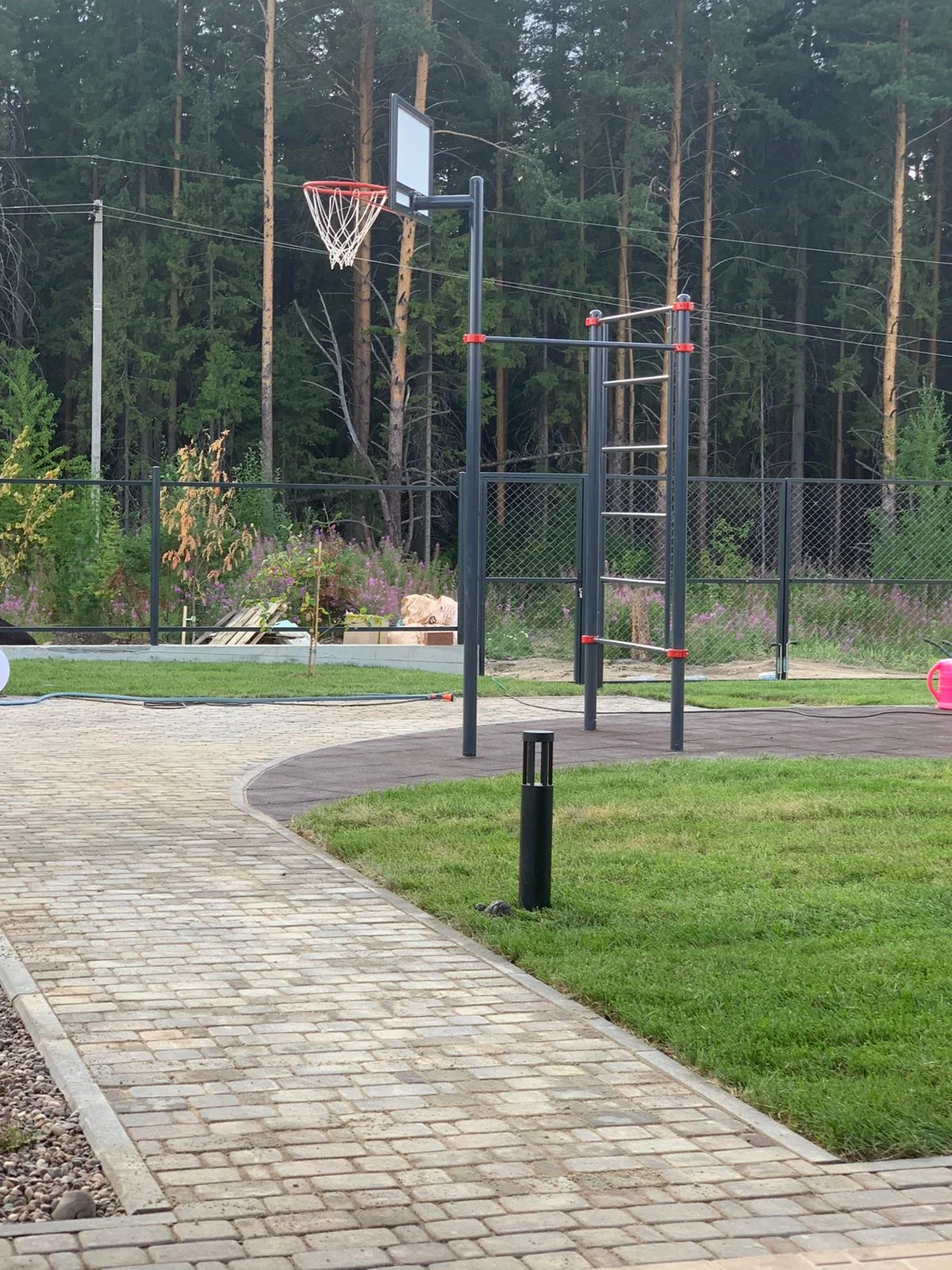 Установка шведской стенки, турника и баскетбольного щита во дворе частного дома - это прекрасное решение для поддержания физической формы и активного отдыха всей семьи. Разместили оборудование так, чтобы его было видно из дома, чтобы родители могли наблюдать за детьми.